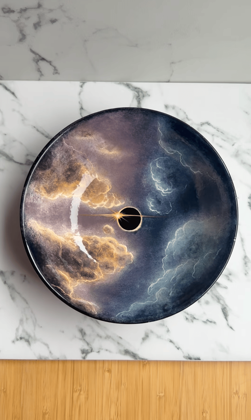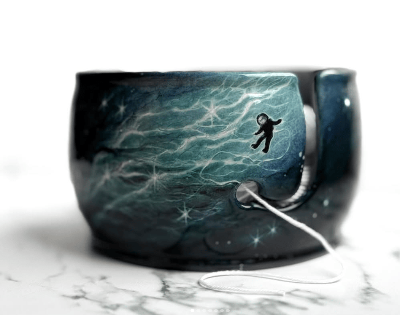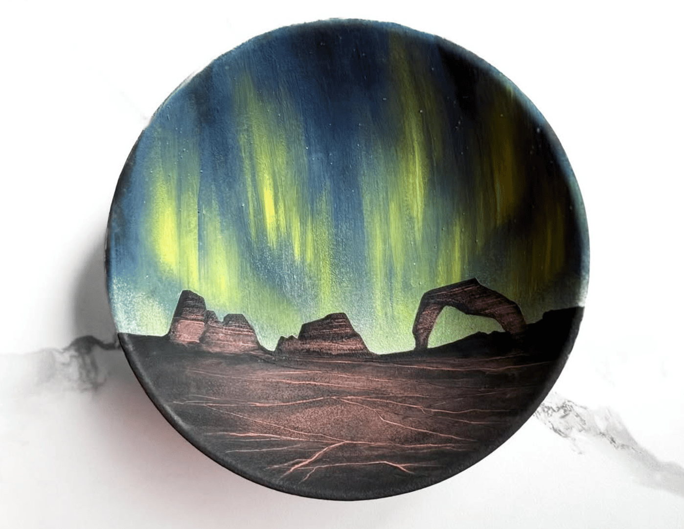 Amy paints galactic scenes on ceramic pieces that look like tiny windows into space. I get Interstellar vibes. I mean that in the most complimentary way possible (it’s my favorite movie). Her work has this otherworldly feel to it, like something you’d spot in a planetarium gift shop but handmade and not from China.